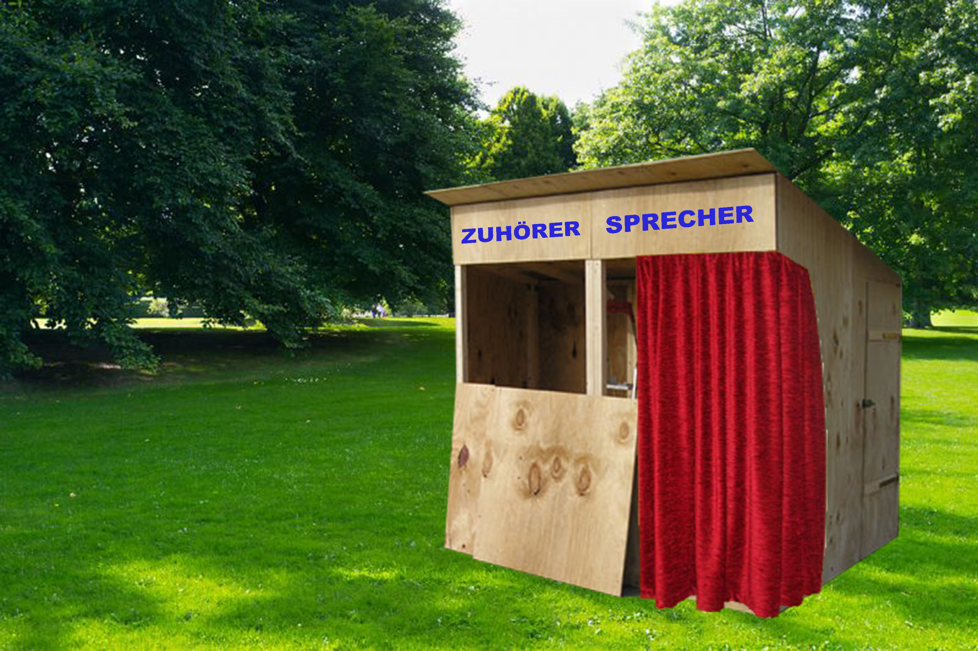 Wie bildet sich die öffentliche Meinung? Wie bildet sie sich hier? Warum Meinungsfreiheit? Und wie lässt sie sich praktisch verstehen? So lautet die Fragestellung dieser künstlerischen Intervention im öffentlichen Raum Bernaus. So spreche ich mich los – Sitzgelegenheiten, beschäftigt sich mit der Praxis und den Orten des freimütigen Sprechens in der Gesellschaft. Die begehbare und bespielte Installation – ein Sprech-, Hör- und Sitzkasten – ist als temporärer Ort im Stadtraum gedacht, an dem sich Zuhörer und Sprecher finden können. Eingeladene und spontane Zuhörer können Hör- und Sitzgelegenheit wahrnehmen und somit den anderen die Möglichkeit geben, gehört zu werden, aber auch Verschiedenstes selbst zu hören. Ob bei Kaffee und Kuchen vor dem Sprech-, Hör- und Sitzkasten oder als Sprecher neben dem Zuhörer sitzend, alle sind dazu eingeladen, sich los zu sprechen. Was werden wir hören? Was sagen? Was möchten Sie hören? Was möchten Sie sagen?